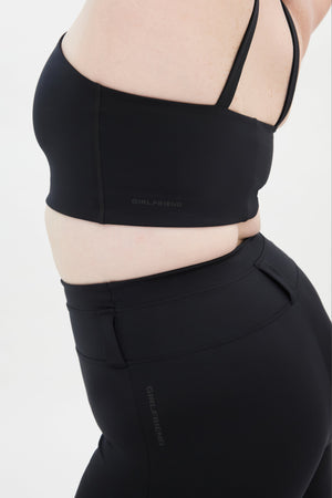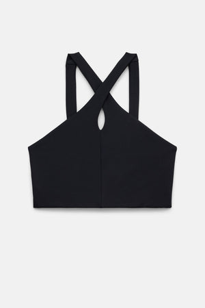 A halter neck style sports bra with a small front keyhole and breathable back design.
