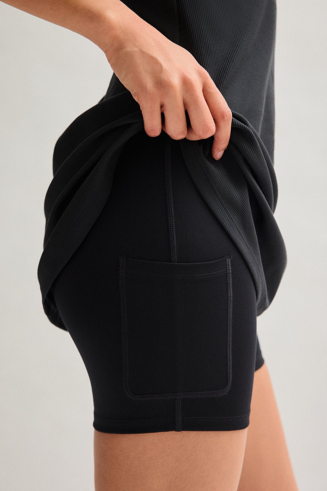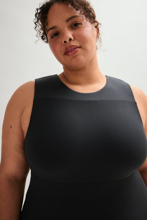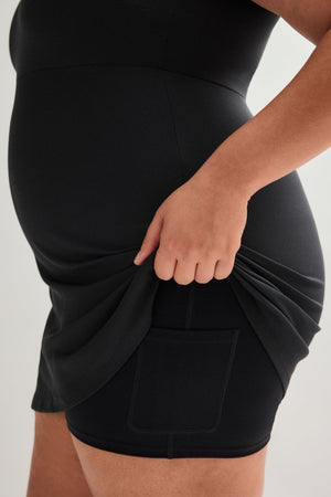 A FLOAT mini dress that moves with you thanks to a built-in romper for coverage and support, directional ribbing for extra contour, and a keyhole back for an elegant, unrestrictive finish.