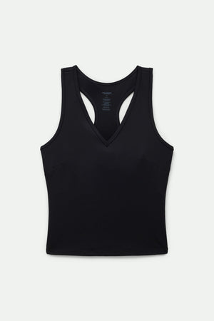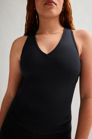 Strike a sporty-prep balance in this Compressive v-neck tank with a built-in bra and removable cups.
