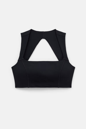 A supportive square neck sports bra with contouring seams and an open back.