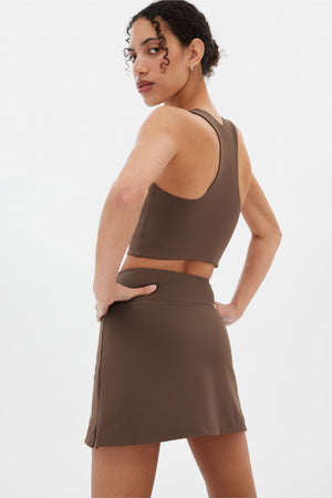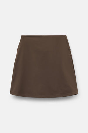 A sporty, high rise exercise skirt with built-in compressive shorts, hidden mesh pockets and side slits.