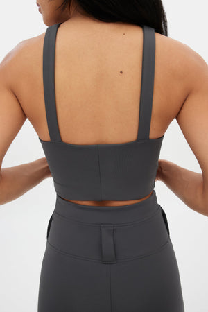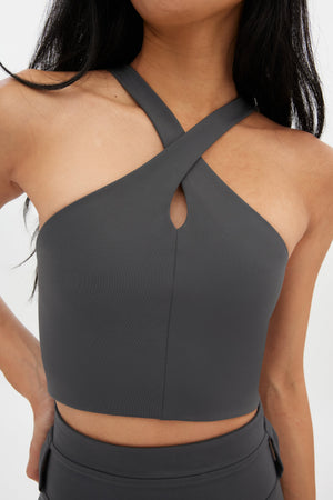 A halter neck style sports bra with a small front keyhole and breathable back design.