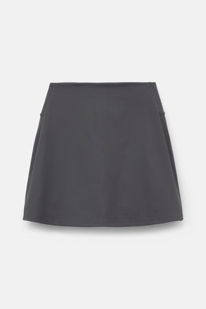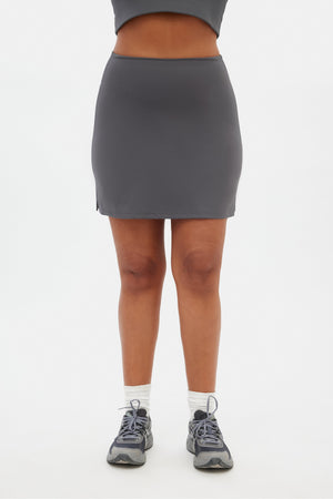 A sporty, high rise exercise skirt with built-in compressive shorts, hidden mesh pockets and side slits.
