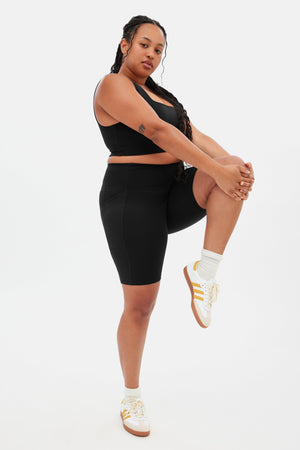 Compressive bike shorts that have a high rise, 8.5” inseam, and you guessed it — pockets.