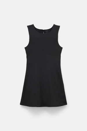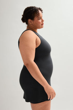 A FLOAT mini dress that moves with you thanks to a built-in romper for coverage and support, directional ribbing for extra contour, and a keyhole back for an elegant, unrestrictive finish.