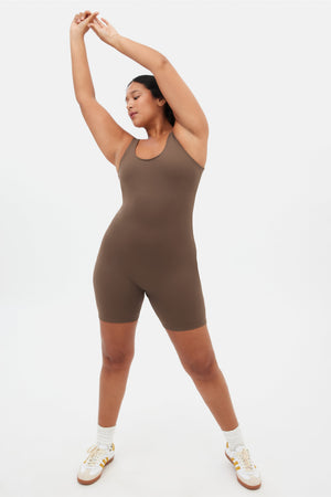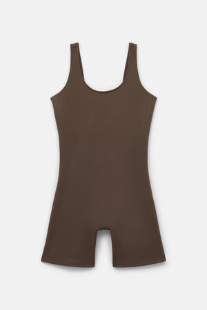 A bike short-length compressive unitard with a scoop neck, low back, and built-in bra.