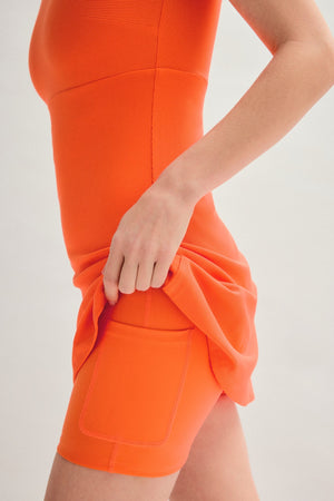 A FLOAT mini dress that moves with you thanks to a built-in romper for coverage and support, directional ribbing for extra contour, and a keyhole back for an elegant, unrestrictive finish.