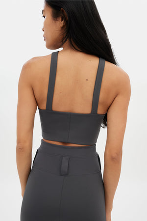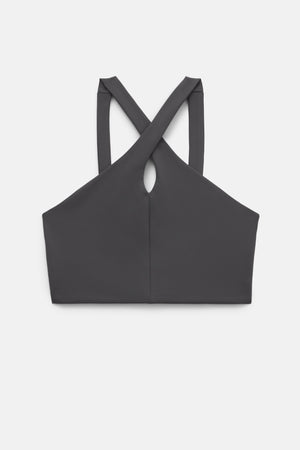 A halter neck style sports bra with a small front keyhole and breathable back design.