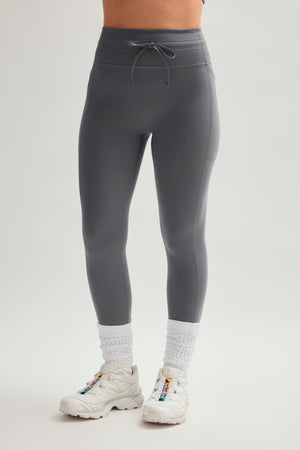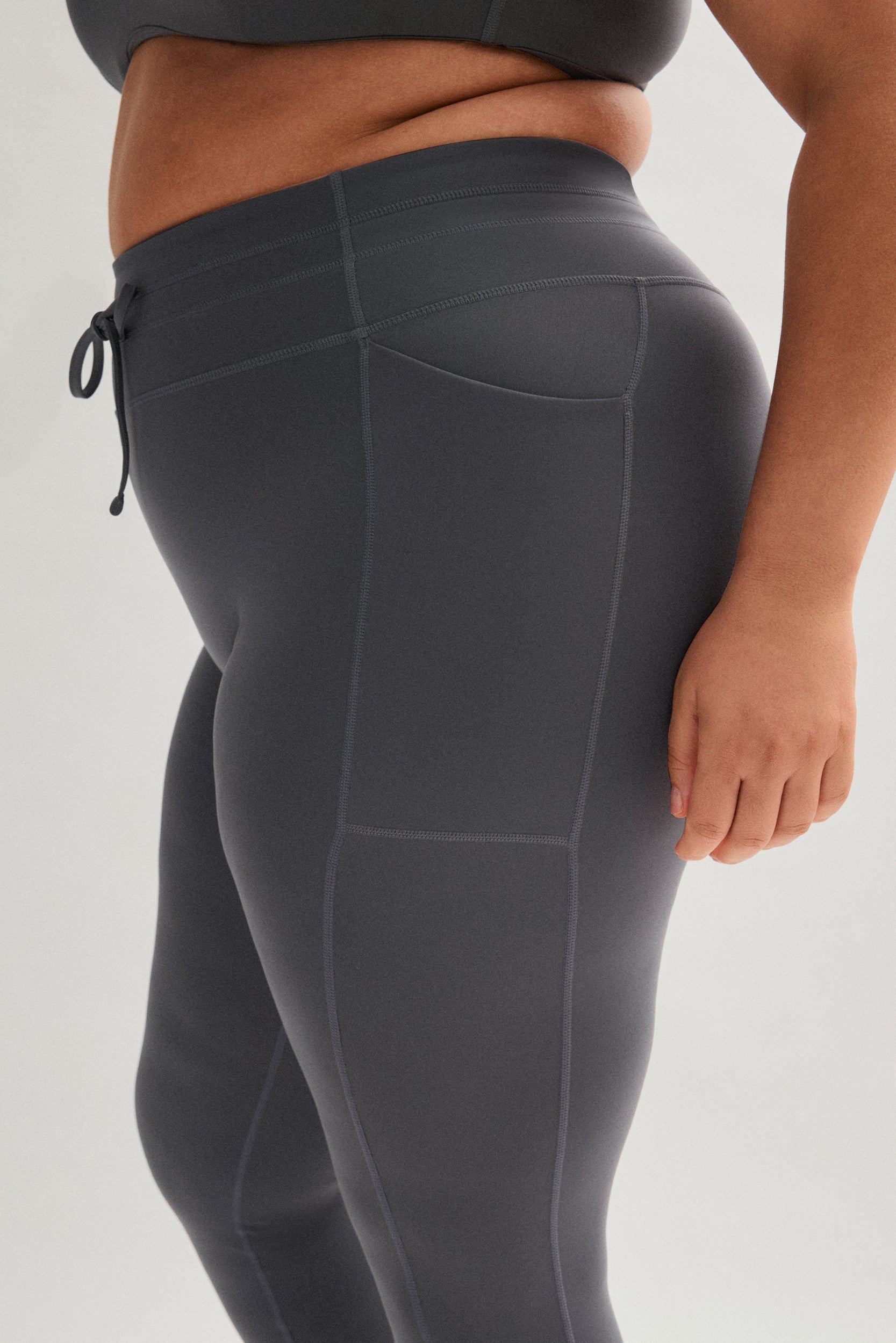 Ultra-secure compressive leggings ideal for runners, with a drawstring waist, side pockets, and contouring back seams.