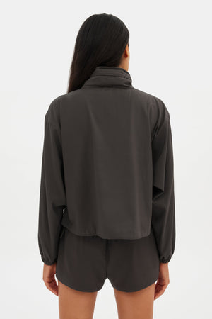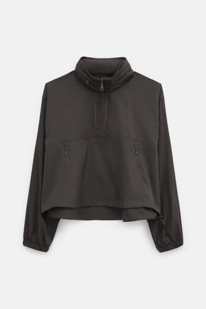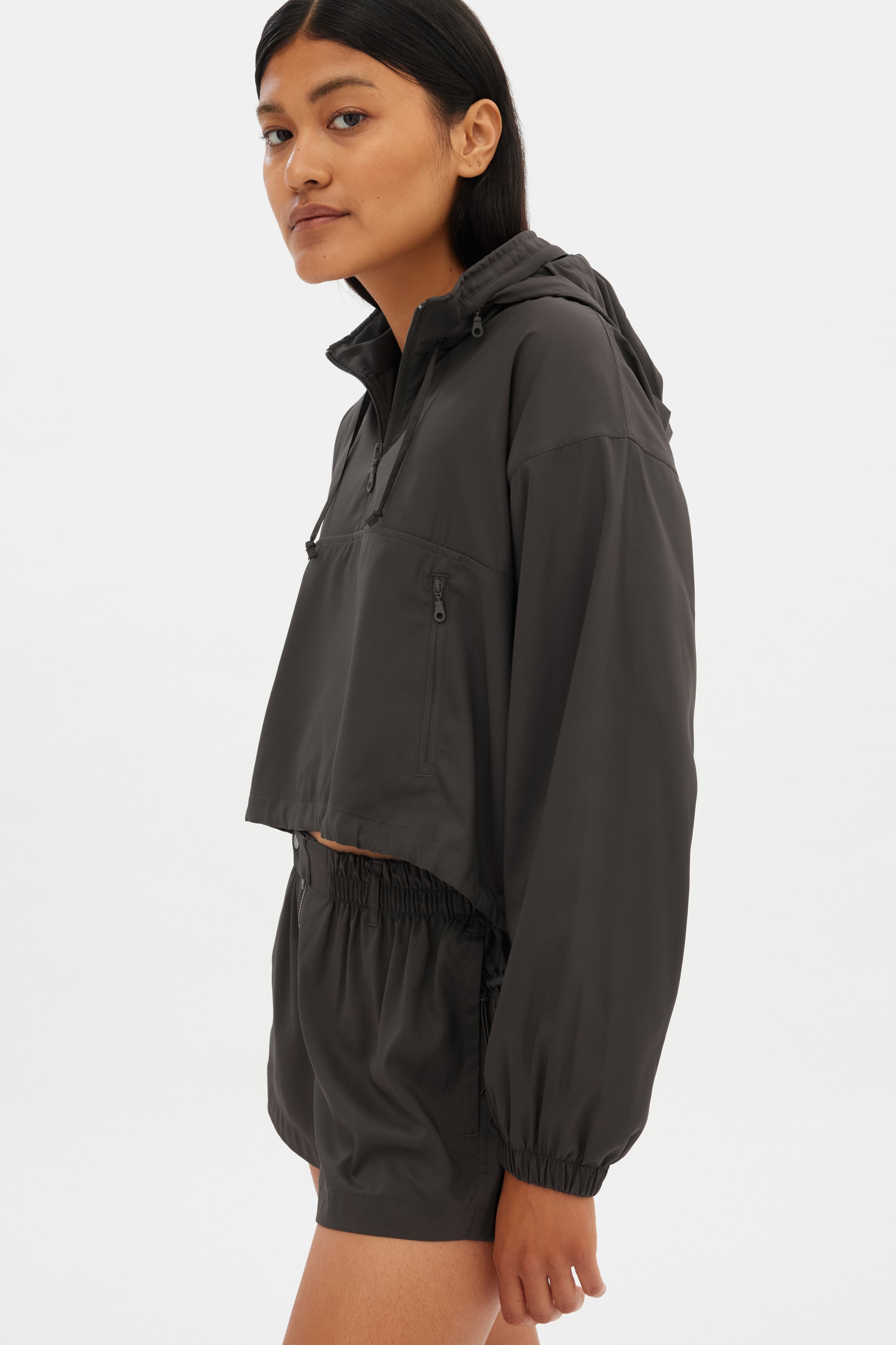A water-resistant windbreaker pullover with a hideable hood, cinchable waist, and a kangaroo pocket.
