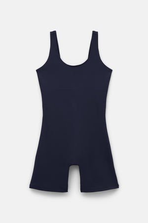A bike short-length compressive unitard with a scoop neck, low back, and built-in bra.