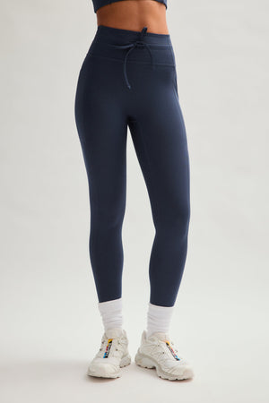 Ultra-secure compressive leggings ideal for runners, with a drawstring waist, side pockets, and contouring back seams.