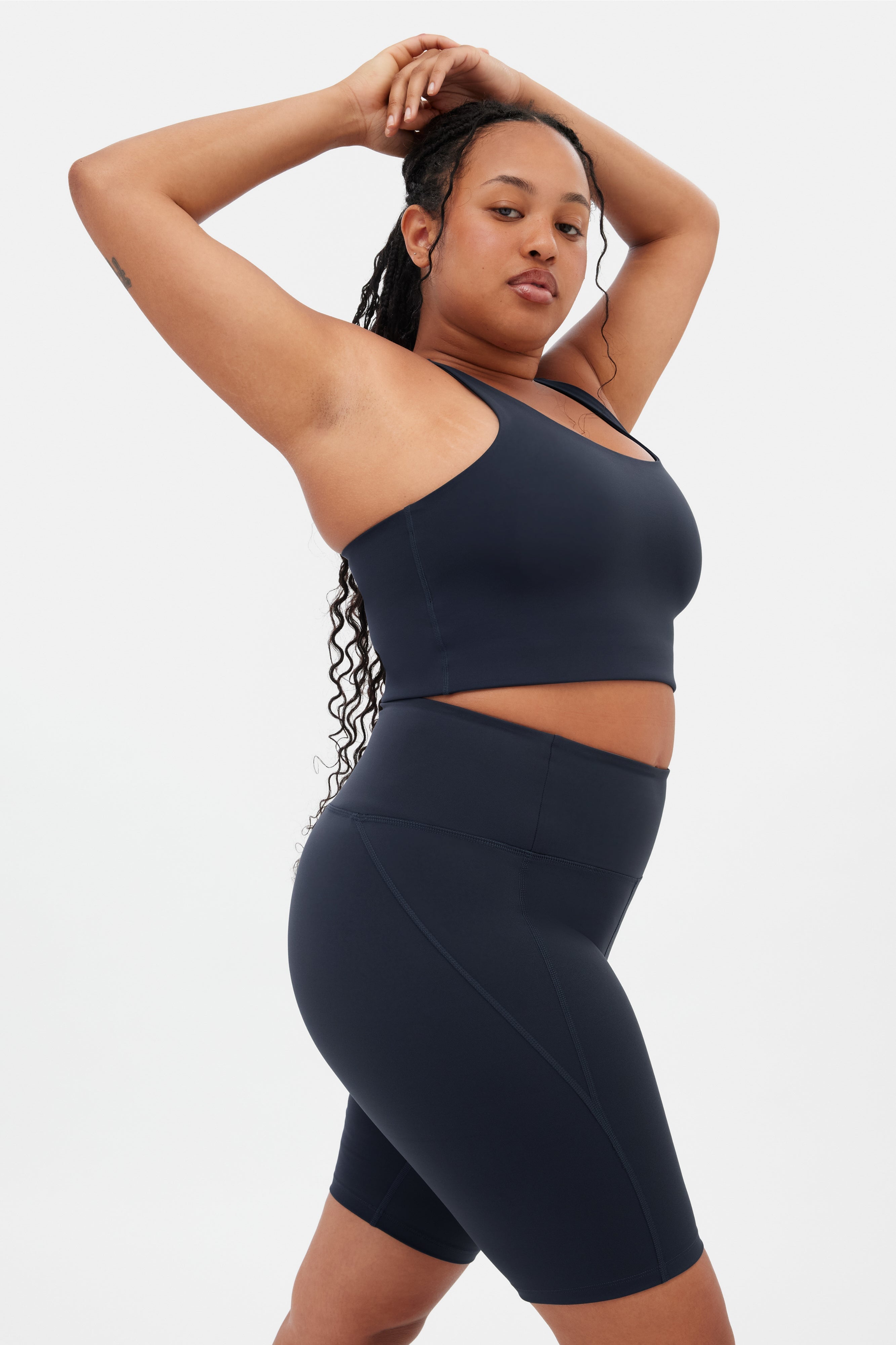 Compressive, high-rise bike shorts with an 8.5” inseam. Ride up-resistant, down for whatever.