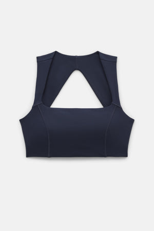 A supportive square neck sports bra with contouring seams and an open back.